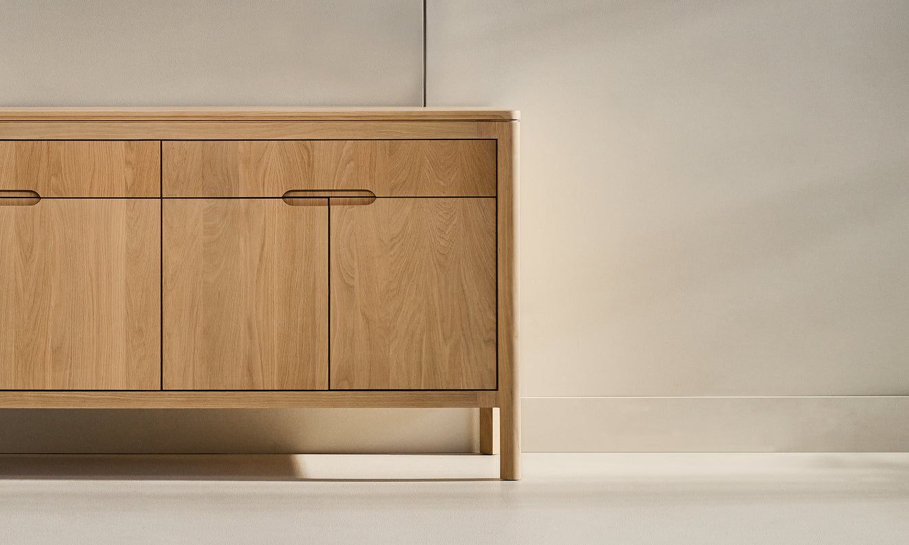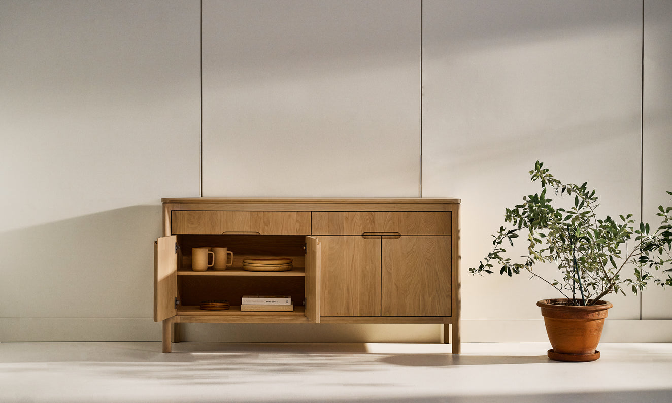 Le S405 est un magnifique buffet doté de deux tiroirs à queue d'aronde, petits mais pratiques, de poignées encastrées et d'étagères intérieures réglables pour du rangement supplémentaire.