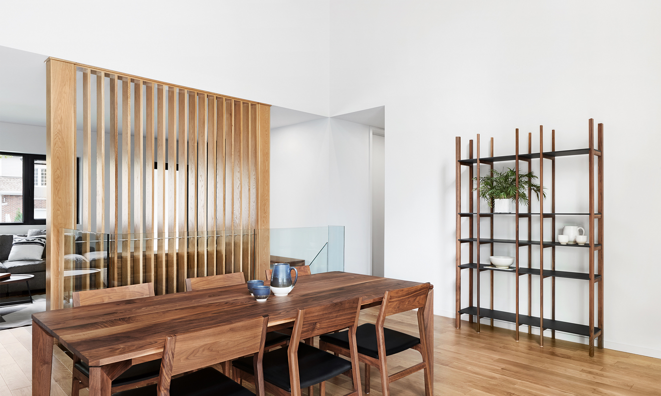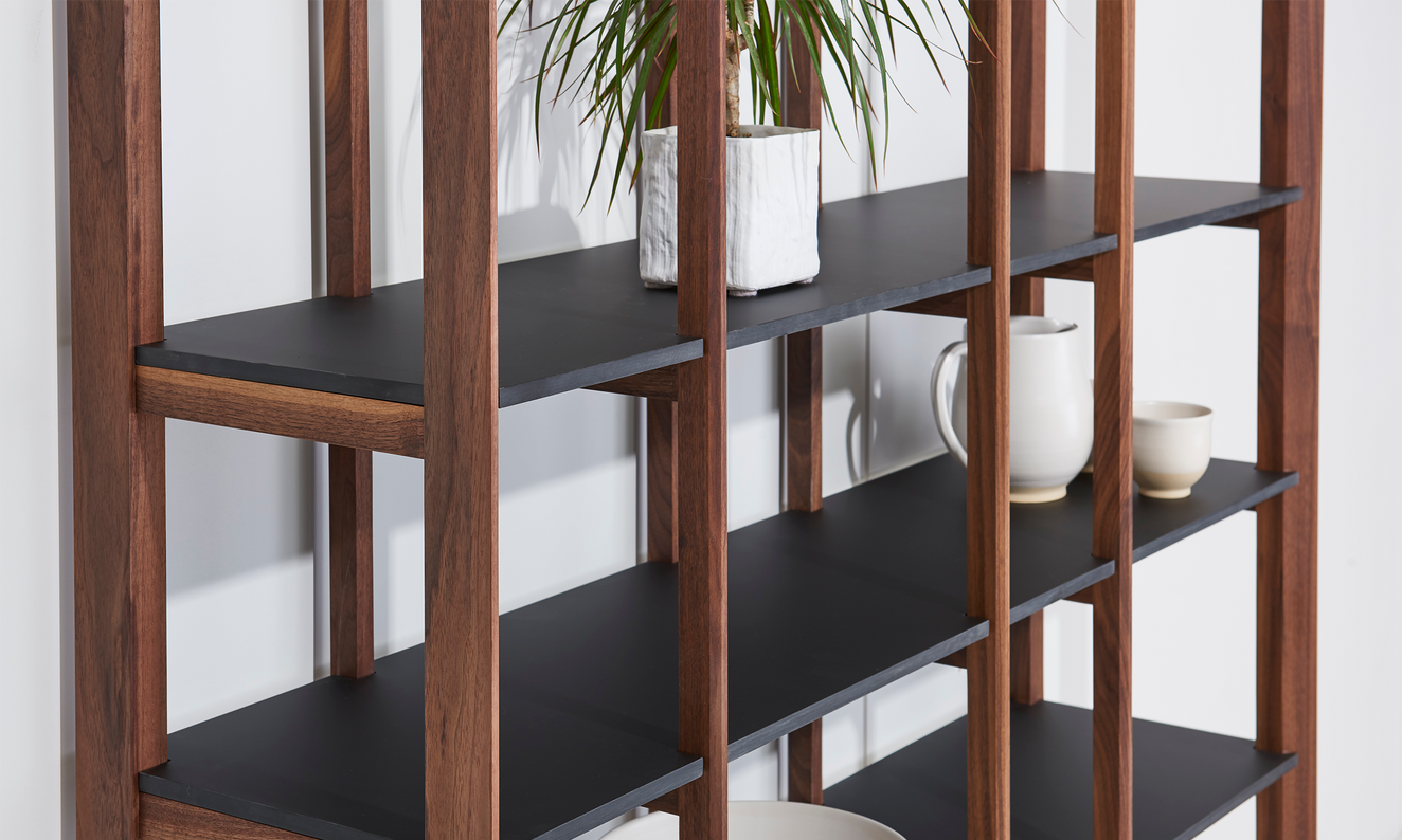 Notre objectif pour la S305 était de créer une unité de rangement minimaliste avec un maximum d’espace. La bibliothèque est composée de tablettes en Fenix NTM entaillées pour s’intégrer autour des montants en bois massif. Le Fenix NTM est une résine acrylique résistante, très agréable au toucher et facile d’entretien. C’est un rangement ouvert élégant s’adaptant à différents intérieurs. Aussi disponible en version grande et en version basse.